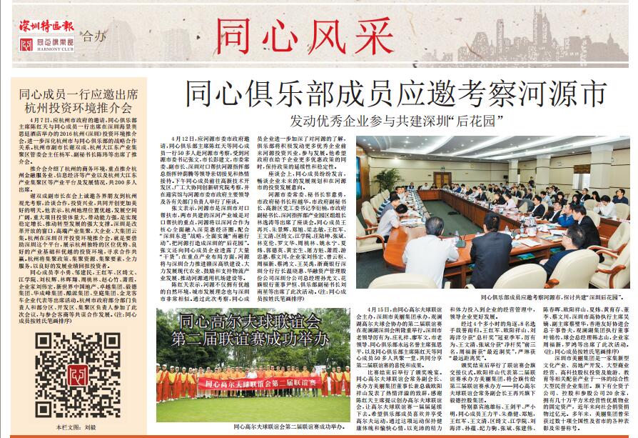 4月12日,应河源市委市政府邀请,同心俱乐部主席陈红天等同心成 员一行50多人赴河源市考察,受到河源市委书记张文,市长彭建文,市委常 委、副市长、深圳对口帮扶河源指挥部 总指挥钟荫腾等领导亲切接见和热情接待。下午同心成员前往高新技术开 发区、广工大协同创新研究院考察,并 在迎宾馆与河源市委市政府主要领导 及各有关部门负责人举行了座谈。 张文表示,河源市是深圳市对口 帮扶市,两市共建的深河产业城是对口帮扶的重点,河源将以深河合作为 核心全面融入深莞惠经济圈,配合 “深圳东进”战略,全面实施“南融行 动”,把河源打造成深圳的“后花园”。 张文还向同心成员企业透露了大量 “干货”:在重点产业布局方面,河源 将与深圳合力推进赣深高铁建设、大 力发展现代农业、鼓励和支持物流产 业发展、推动河源通用机场建设等。 陈红天表示,河源不仅拥有优越 的自然环境,城市发展理念也与深圳 市非常相似。通过此次考察,同心成